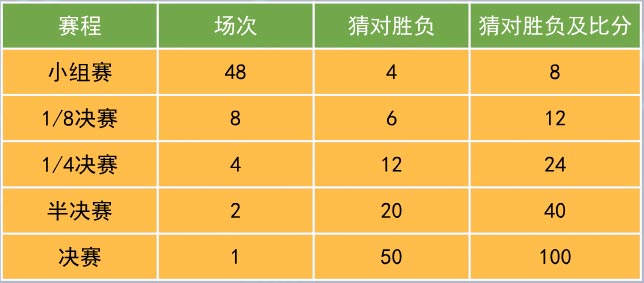 競猜賽事將以積分式排名來確定獲獎者,世界杯結束后按照累計的總分數高低,進行獎品的發(fā)放。每場競猜猜中勝負即得對應的分數,同時猜中勝負和比分則可得雙倍分數,從小組賽到決賽,每場競猜成功獲得積分將會越來越多,即使是后面加入的競猜者也有機會獲得較高的排名!