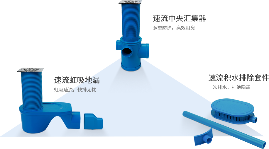 系統(tǒng)采用豐富的功能型管件,滿足衛(wèi)生間干濕分區(qū)布局。速流虹吸地漏用于濕區(qū),滿足淋浴區(qū)快速排水需求;速流中央?yún)R集器用于干區(qū),